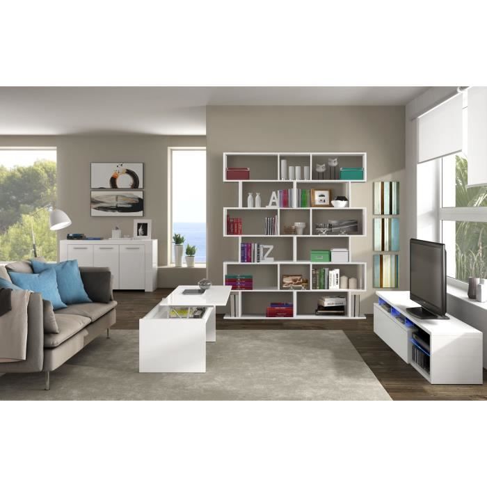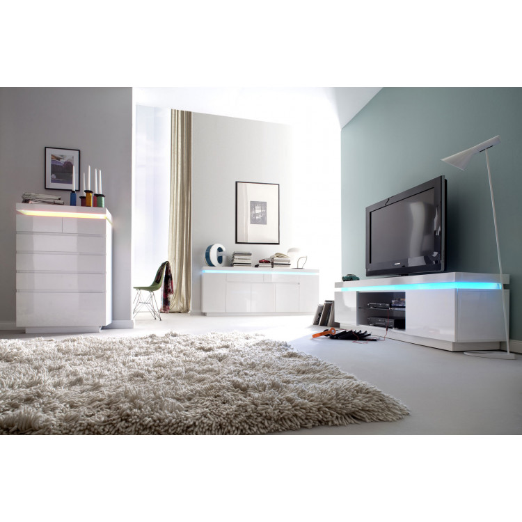 Ce meuble TV Blue-Tech allie design moderne et fonctionnalité ! En blanc brillant avec éclairage LED bleu intégré sur les étagères en verre. Dimensions 150x43x41cm (LxHxP). La porte battante s'ouvre par simple pression (système Push) avec piston de retenue. Support TV jusqu'à 40kg et étagères jusqu'à 3kg. Fabriqué en Espagne avec panneau mélaminé de qualité certifié PEFC. Surface non poreuse facile à nettoyer. Montage nécessaire avec notice et fixations incluses. Un meuble élégant qui organise votre espace TV tout en créant une ambiance lumineuse moderne. Parfait pour les salons contemporains !