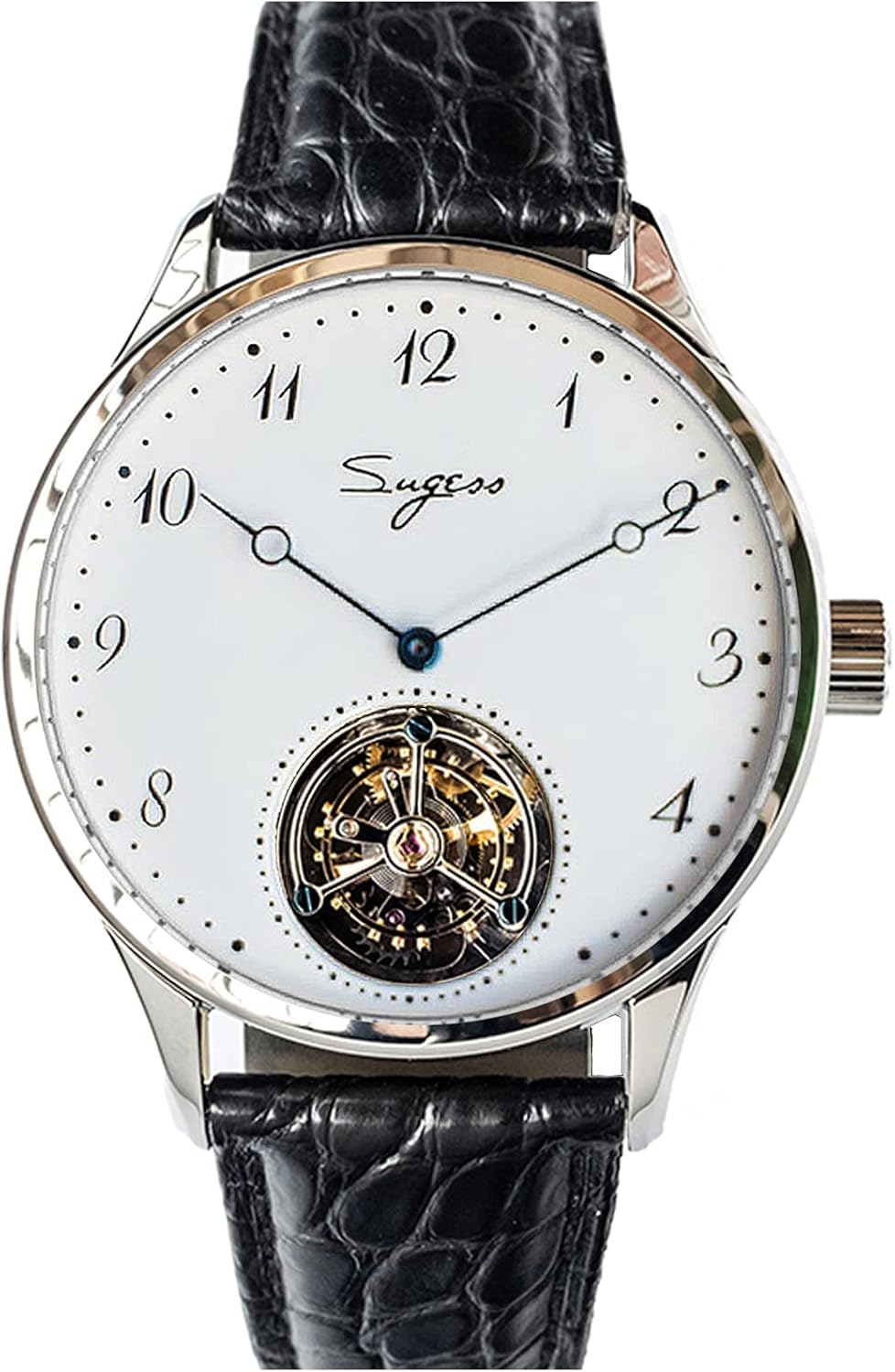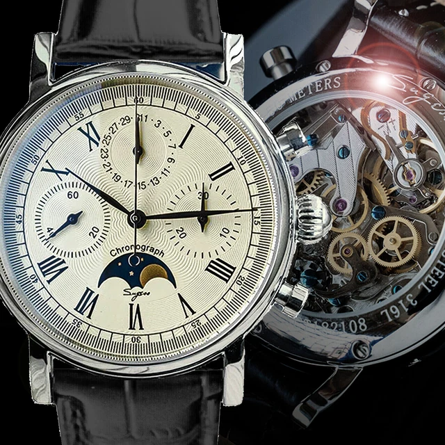 Salut les amateurs d'horlogerie ! La Sugess MoonPhase Master est une pépite mécanique avec chronographe à roue à colonne et affichage de phase de lune (29,5 jours). Mouvement Seagull ST1908 authentique, remontage manuel, 23 rubis, 45h de réserve. Boîtier acier 316L de 40mm, épaisseur 14mm, verre saphir anti-rayures. Cadran 'grain de blé' élégant, vis bleues, fond transparent. Bracelet cuir véritable + boucle papillon. Résistance à l'eau 5 ATM (50m). Un véritable instrument de précision alliant tradition horlogère et design raffiné. Parfaite pour les occasions spéciales ou les collectionneurs. Bien plus qu'une montre, c'est un chef-d'œuvre à votre poignet qui attirera tous les regards ! Instructions en anglais incluses.