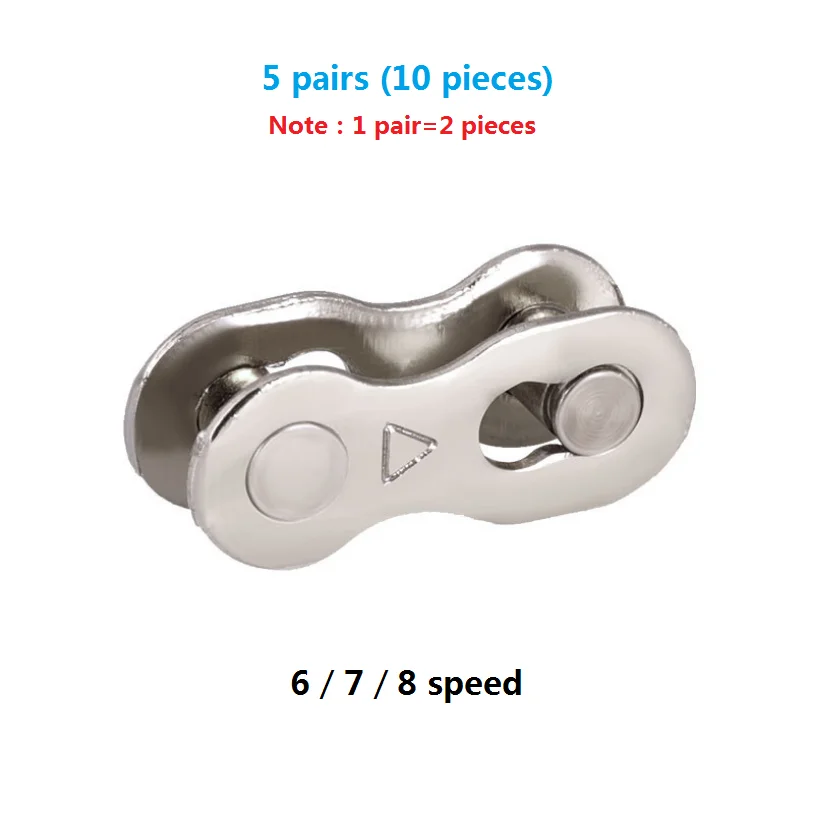 Pour les cyclistes qui bricolent leur vélo, ce lot de 6 maillons rapides est un must-have ! Conçus pour les transmissions 8 vitesses, ils sont en acier carbone haute qualité et résistent à la rouille. Le crochet de chaîne en acier inoxydable inclus facilite le montage et le démontage. Réutilisables jusqu'à 5 fois, ils sont parfaits pour remplacer un maillon endommagé, nettoyer sa chaîne ou dépanner en randonnée. Compatibles VTT, vélos de route et autres. Un accessoire malin, durable et économique à toujours avoir sous la main dans son atelier ou sa sacoche de vélo !