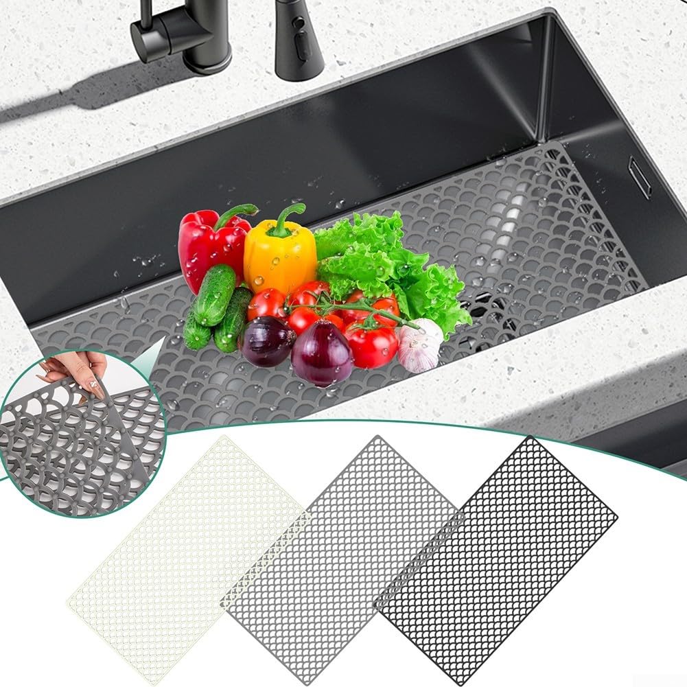 Ce tapis d'évier en silicone est un vrai game-changer pour votre cuisine ! Mesurant 76x40 cm, vous pouvez le découper pour l'adapter parfaitement à votre évier et à l'emplacement de la bonde. Les nombreux picots antidérapants maintiennent le tapis en place et permettent à l'eau de s'écouler, gardant ainsi votre évier au sec. Il protège votre vaisselle fragile contre les chocs et les rayures lorsque vous lavez. En silicone de qualité, il résiste à la chaleur et est facile à nettoyer - un coup d'éponge suffit ! Utilisez-le aussi comme égouttoir à vaisselle temporaire ou tapis de refroidissement pour les plats chauds. Disponible en noir, gris ou blanc, il s'intègre à tous les styles de cuisine. Un accessoire malin qui rend la vie plus facile !